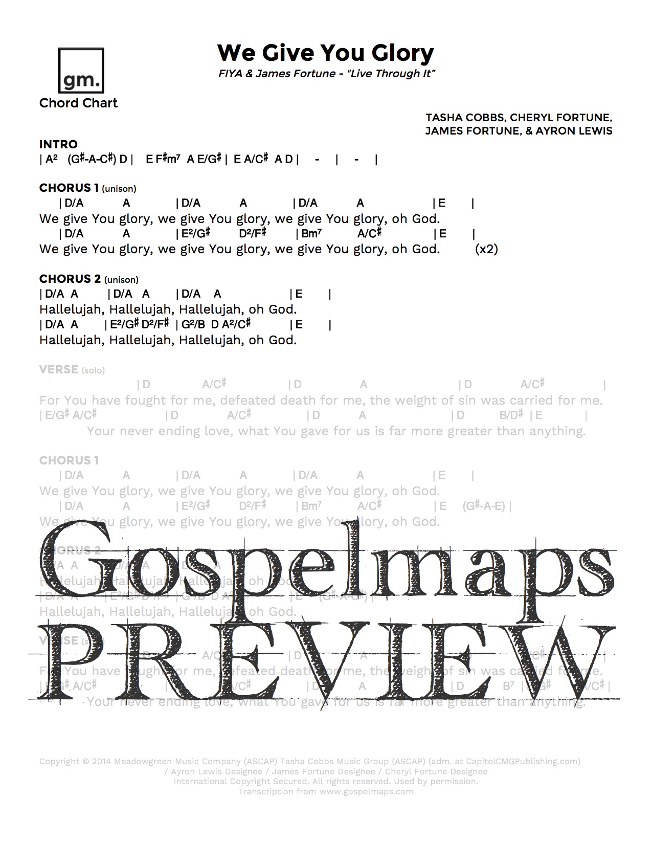 Download sheet music for We Give You Glory by James Fortune & FIYA, from the album Live Through It. Products for this song include Rhythm-Vocal Chart, Rhythm Chart, and Chord Chart.